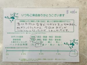 スタッフブログ☆お客様のお声☆2022.08.27こちらのお客様は6年前から通ってくださっているMさまです。 いつも明るく笑顔が素敵なM様。 お仕事が多忙な中、『プリエに来ることが楽しみ♪』と言ってくださいます。 こころから嬉しく思います。 9月もお逢いできますことを楽しみにしています。 Tweet お急ぎ下さい☆前の記事 お客様のお声次の記事