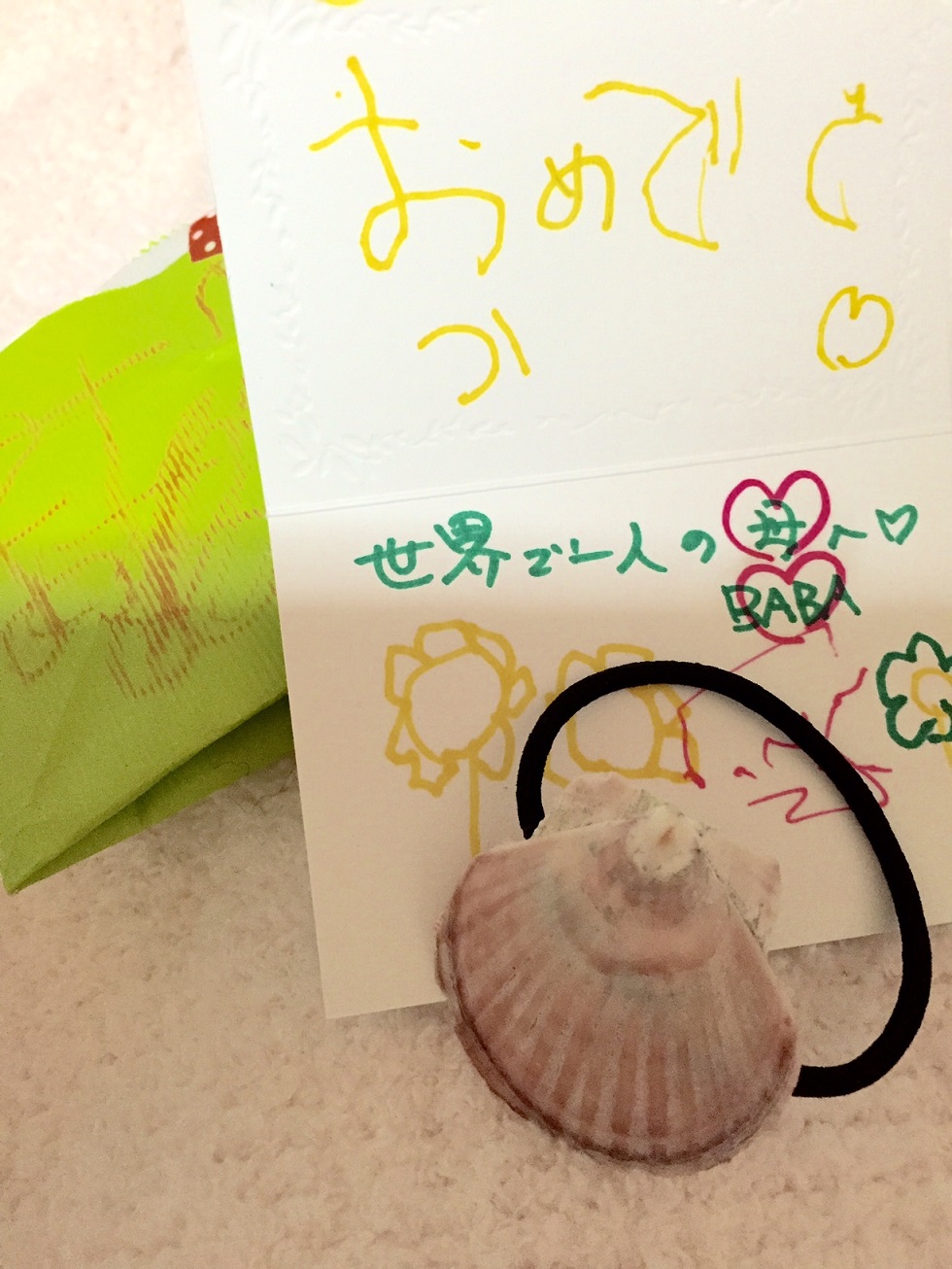 海岸で拾った貝殻で作ったみたいです。(涙)