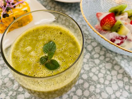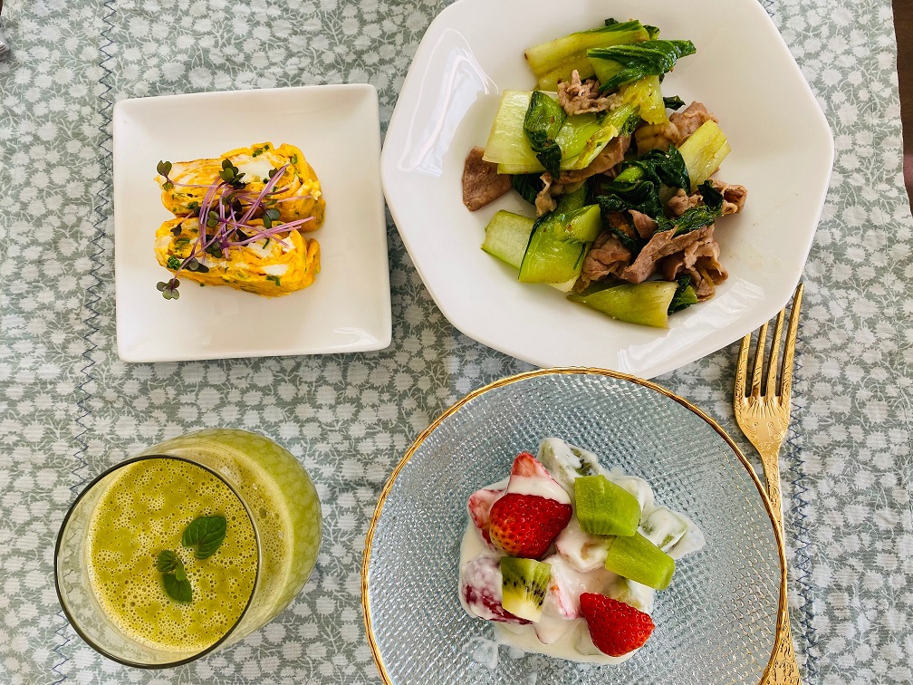 今朝のスムージー(小松菜、トマト、イチゴ、キウイ、亜麻仁油、すりごま)です。