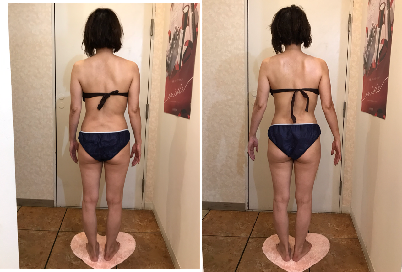 ビフォーは左右のバランスが違います。右側の肩甲骨は出ていますが左側は埋まっています。