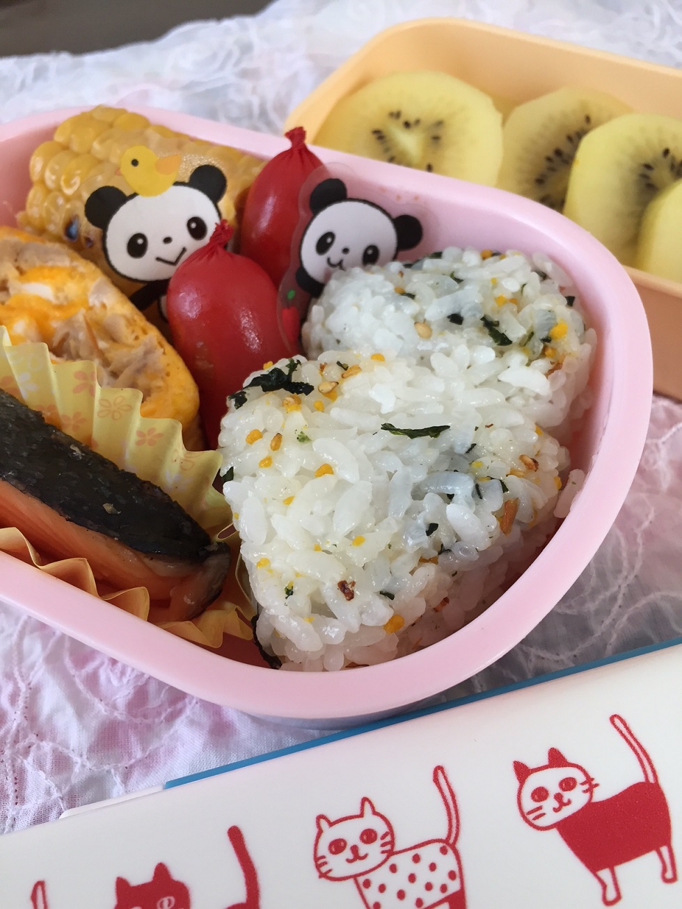 シーチキン玉子焼き・焼き鮭・タコさんウインナー・トウモロコシ・おにぎり。