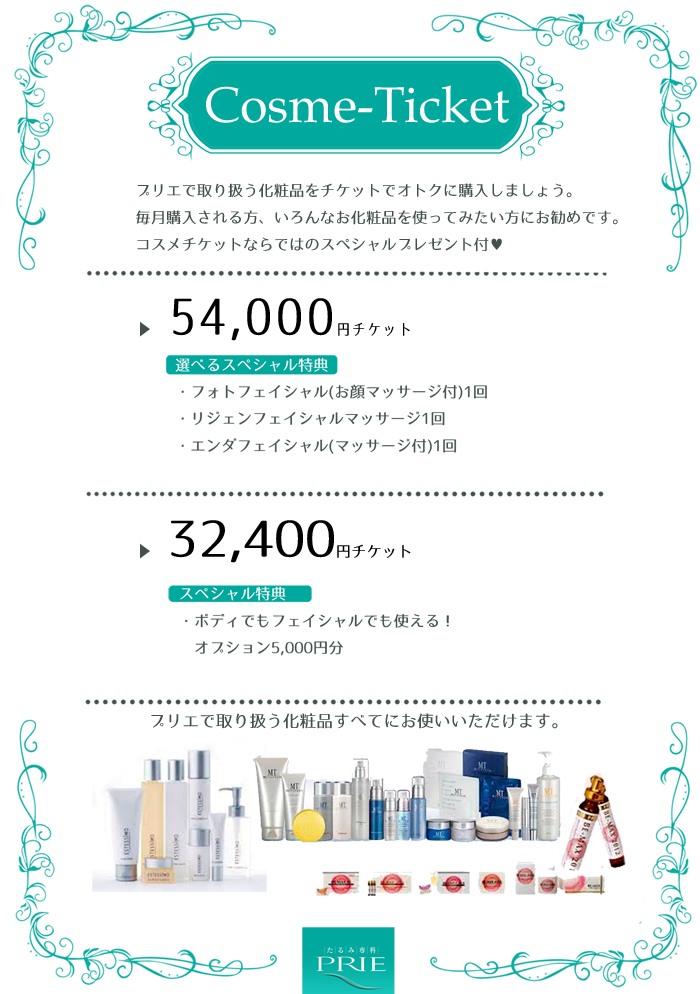 昨年から導入しましたMT化粧品・そしてBE‐MAX・エステシモ・セレスどれでも使えるコスメチケットを発売しております。