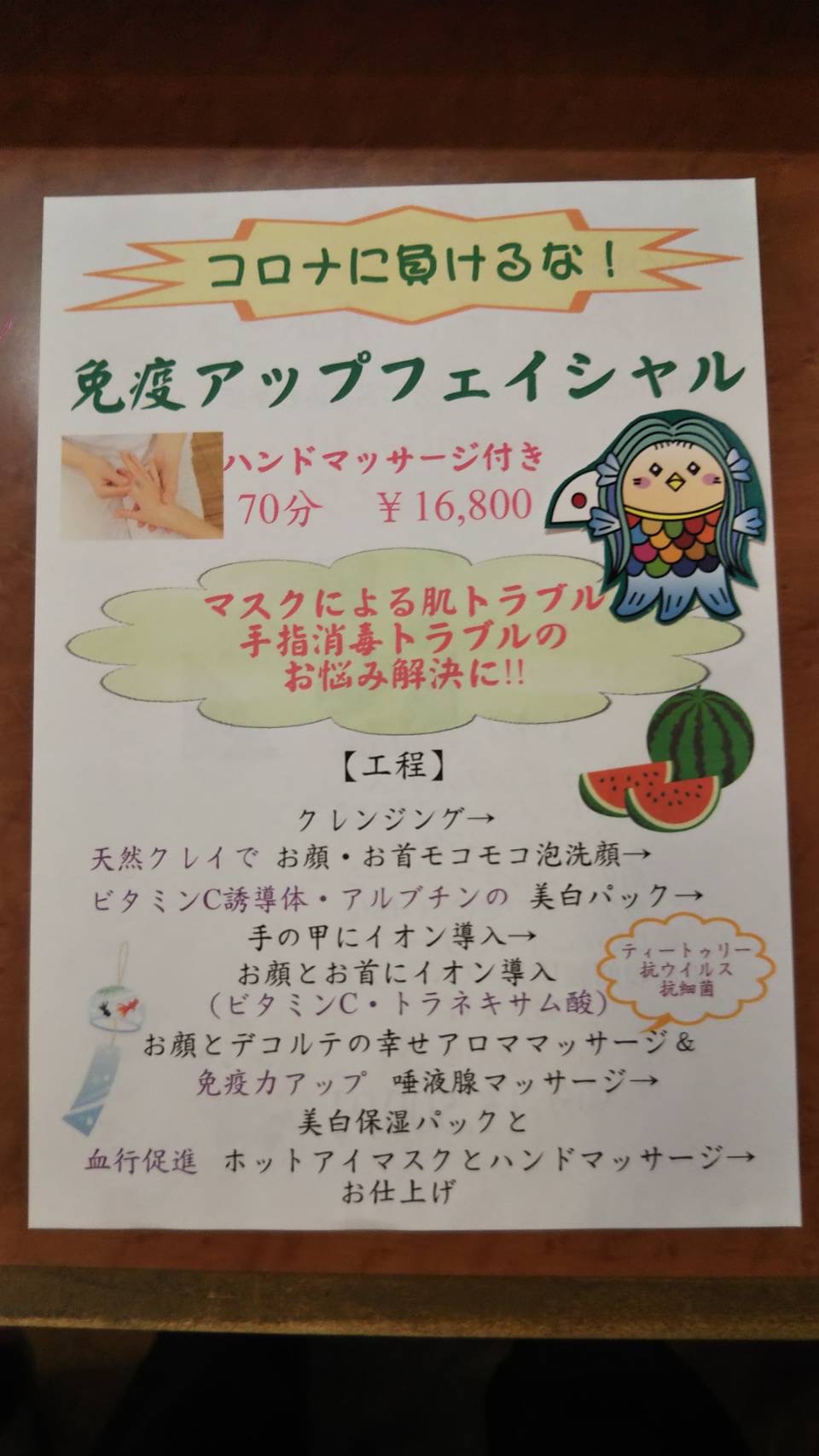7月8月は【コロナに負けるな!免疫アップフェイシャル】70分16800円です。