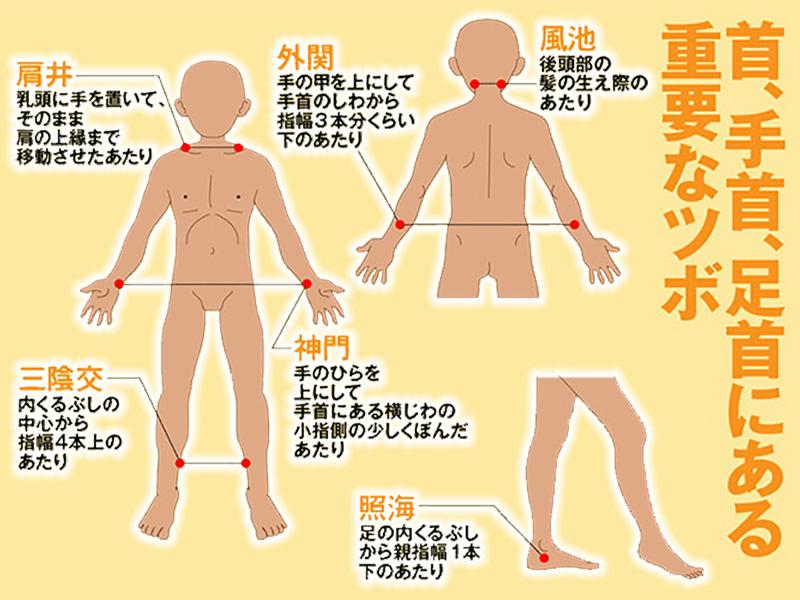 この血流の関所ともいわれている部分は、それぞれ皮下の浅いところを動脈が通っているので、ここが冷えると体温が下がり寒さがこたえます。