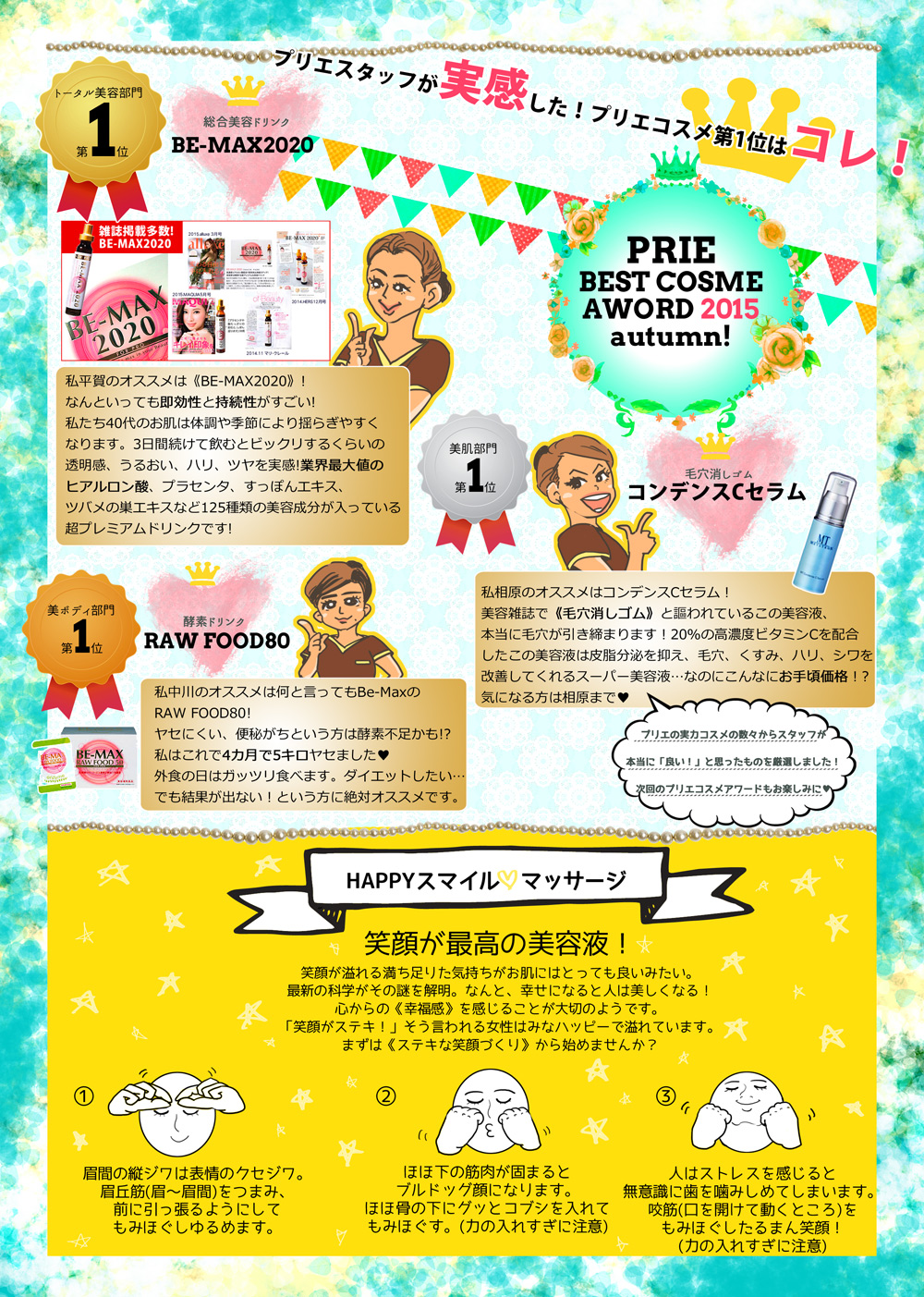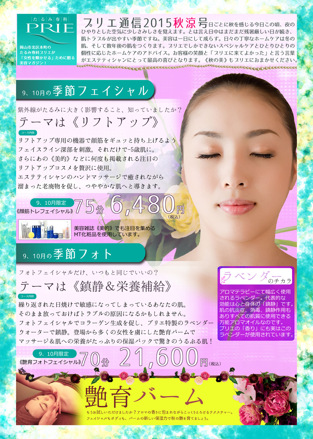 お知らせプリエ通信9、10月号2015.09.03 ★プリエ通信涼秋号★秋のプリエ通信は・秋の季節メニュー・プリエスタッフ厳選!使ってわかったプリエコスメアワード★・HAPPYスマイルを作る!簡単マッサージなどなど、盛り沢山な内容です。お楽しみに★ Tweet ★秋の季節フェイシャル★前の記事 アニバーサリー♪次の記事