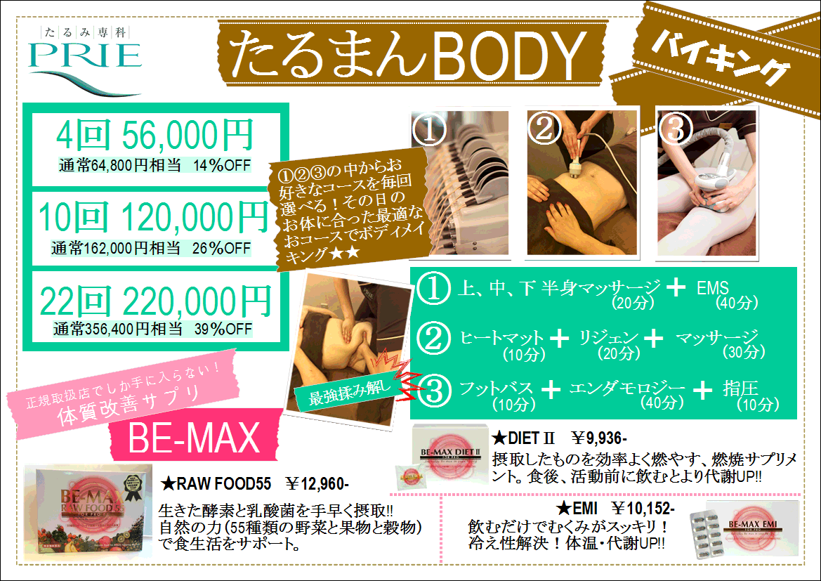 人気の3コースを組み合わせて使える「たるまんBODYバイキング」。