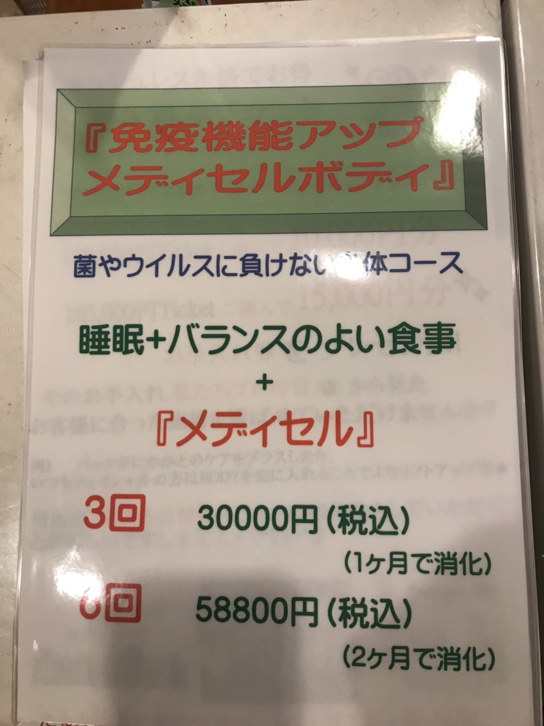 スタッフブログ免疫力アップ2020.03.15 こんばんは、花房です。 コロナの影響で大変な事になっていますね。 プリエでは、衛生面や機具などの消毒などを徹底して行っています。こんな時期だからこそ、バランスとれた食事や睡眠をしっかりとり、自分の免疫力を上げてコロナに負けない健康なな体作りが大切ですよね。プラス、メディセルがおすすめです! メディセルは、しっかりリンパや血流を良くすることにより代謝が上がり免疫力もアップします! プリエでは、皆様の免疫力を上げ健康な体作りのお手伝をさせて頂きます。 Tweet ☆今週のサロン空き情報です☆前の記事 ☆お客様のお声☆次の記事