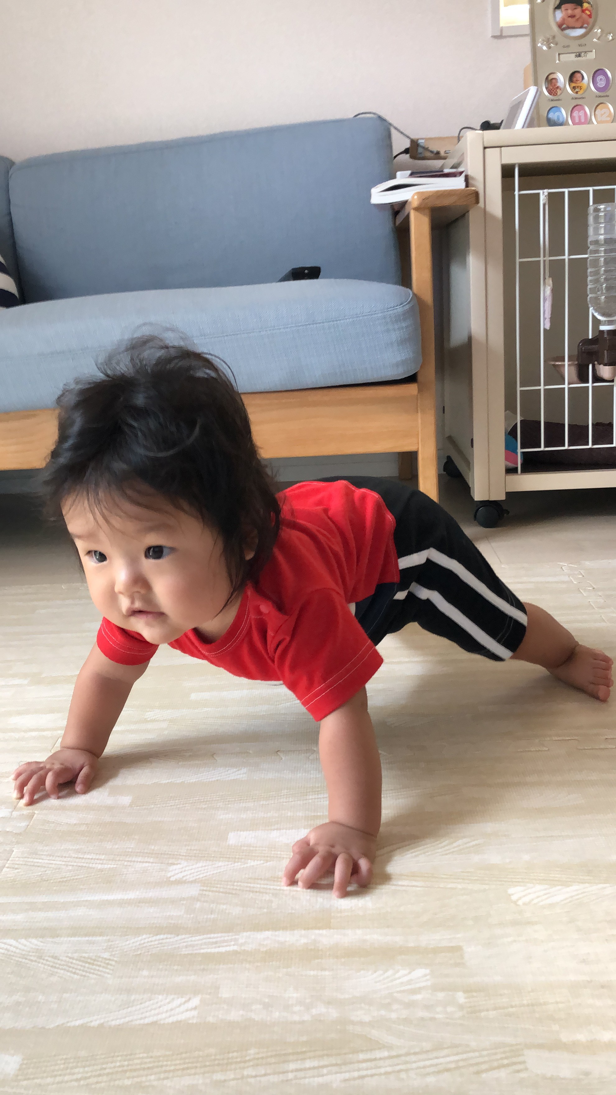 今、毎日腕立て伏せのような格好をして、ハイハイをしようと頑張っています。
