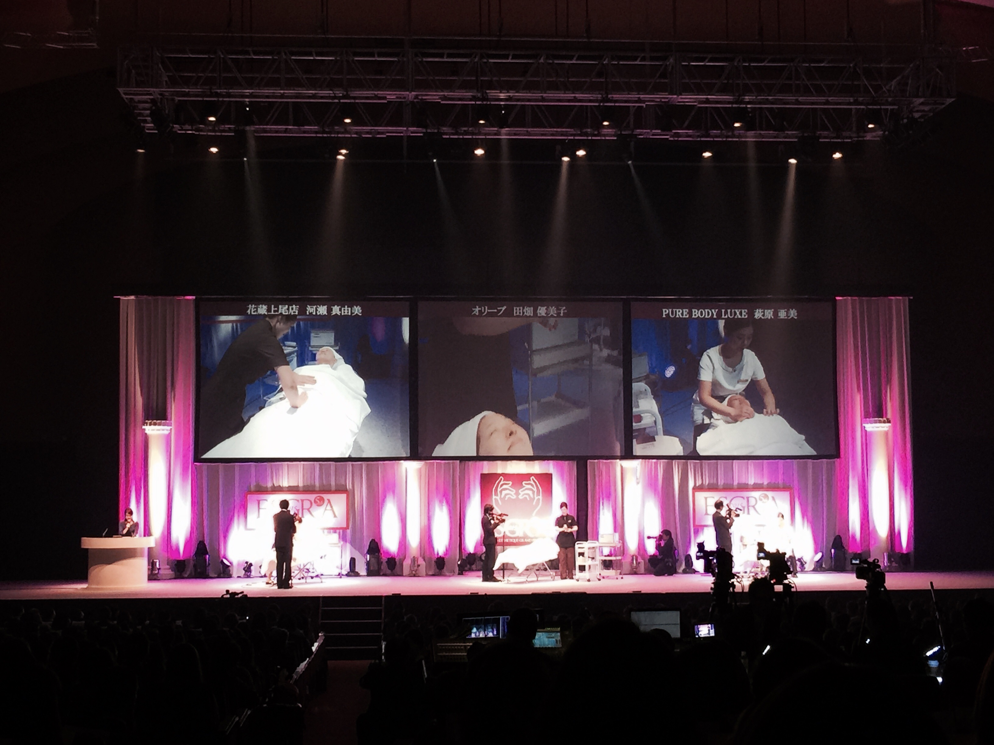 パシフィコ横浜のホールで何千人もの前で、フェイシャルの技術を披露しているエステティシャンの緊張感がこちらにも伝わってきました。