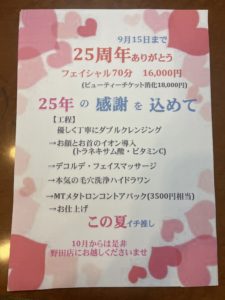ダブルクレンジング→お顔お首イオン導入(シミ、肝斑に効く2種類導入)→フェイシャルマッサージ→デコルテマッサージ→お顔ピーリング→ハイドラワン毛穴洗浄→MTコントアパック(3500円相当パック)