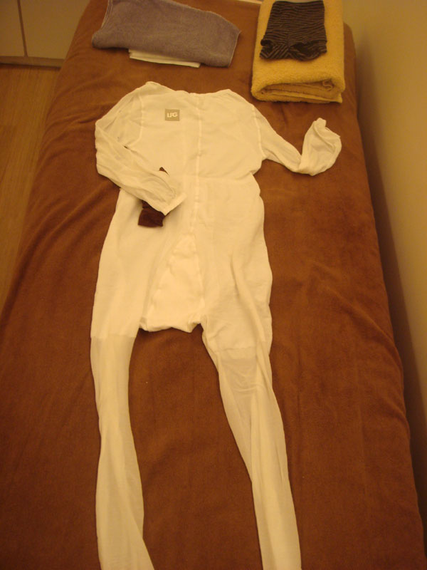 今、プリエの人気コース、ボディーのエンダモロジーは、白い全身タイツ(モジモジスーツ←スタッフの間ではそう呼んでいます…)を着てもらって施術を行います。