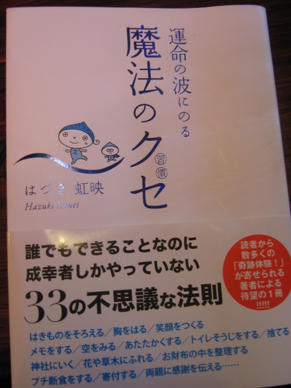 みなさんこんにちは(^^♪本日お勧めの本をご紹介します。はづき虹映さんの運命の波にのる魔法のクセ という本です。内容は、誰でもできる事ですが成幸者しかしていない33の法則があるそうです。法則+数字の表す意味も書いていてとてもおもしろいです。例えば空をみるとつねに胸をはって行動するクセがつき良い運気を取り込む事ができるそうです。他にも花や草木にふれたり、神社に行く、履物をそろえる。等色々な事が書かれています。私はエステという仕事とは、つねに感性を磨いていなければいけないといつも考えているので割と法則にそった行動をしているようです。33のうちまだ出来ていない所をのばしていこうと思います。すごく読みやすく充実感にひたる事ができるのでみなさんも一度読んでみてくださいね。またオススメの本があればご紹介します。