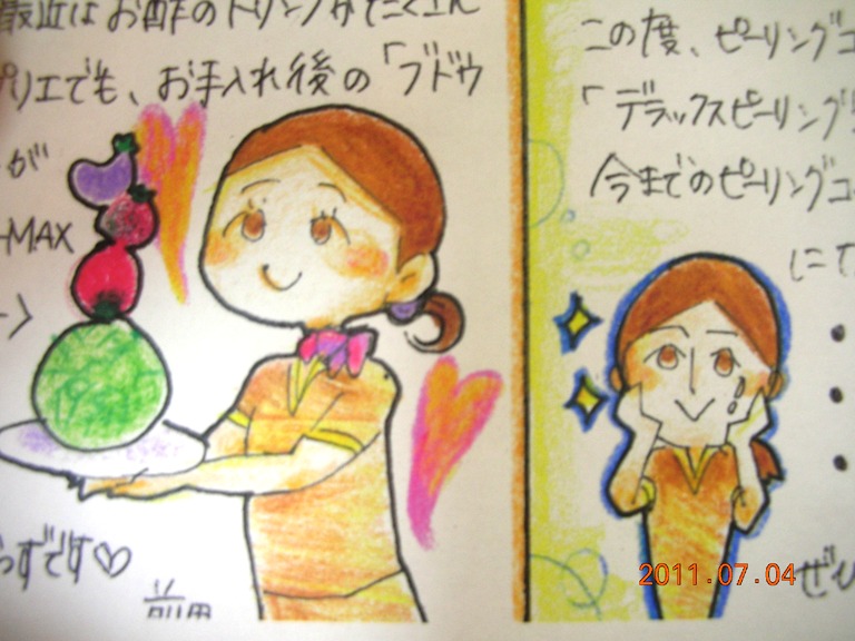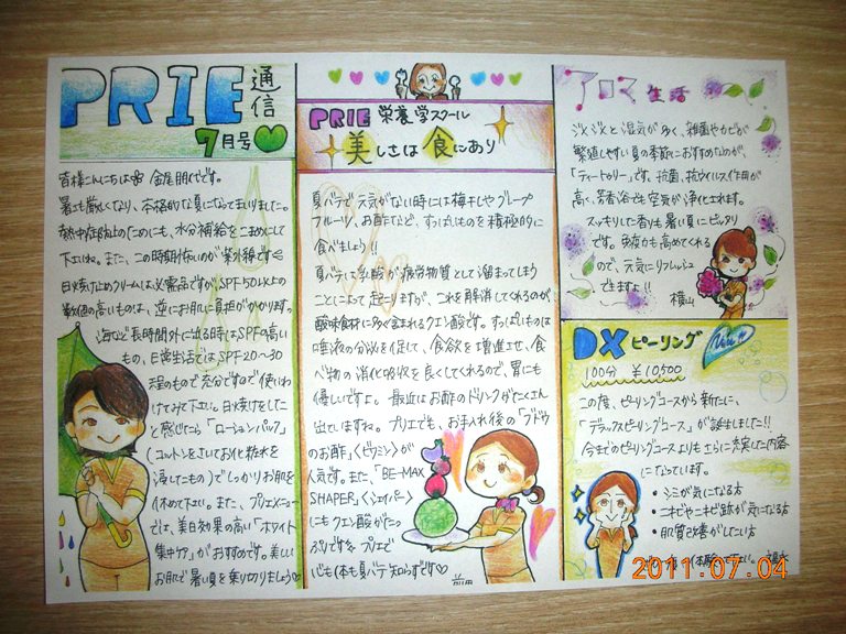 7月にご来店頂いた方は、もうご覧になっているかもしれません。今回の内容はスタッフの似顔絵付きで、紫外線対策、食事(夏バテ対策)、アロマ、新メニューのデラックスピーリングについて記載しております。お越しの際は是非読んでみて下さい☆