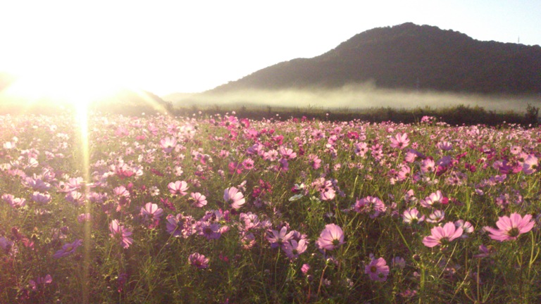 まだ暗い時間に出発し、薄暗いコスモス畑、オレンジがかったもの、すっかり日が昇ってとてもさわやかなコスモス畑…